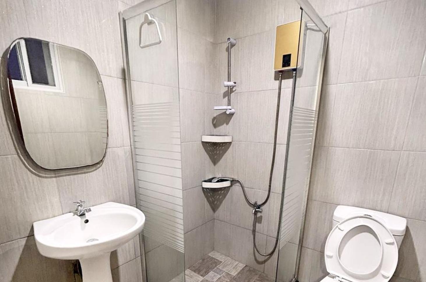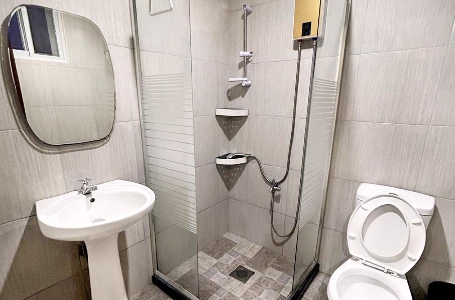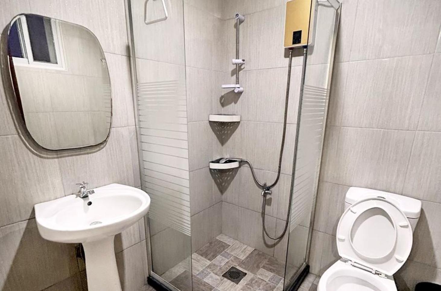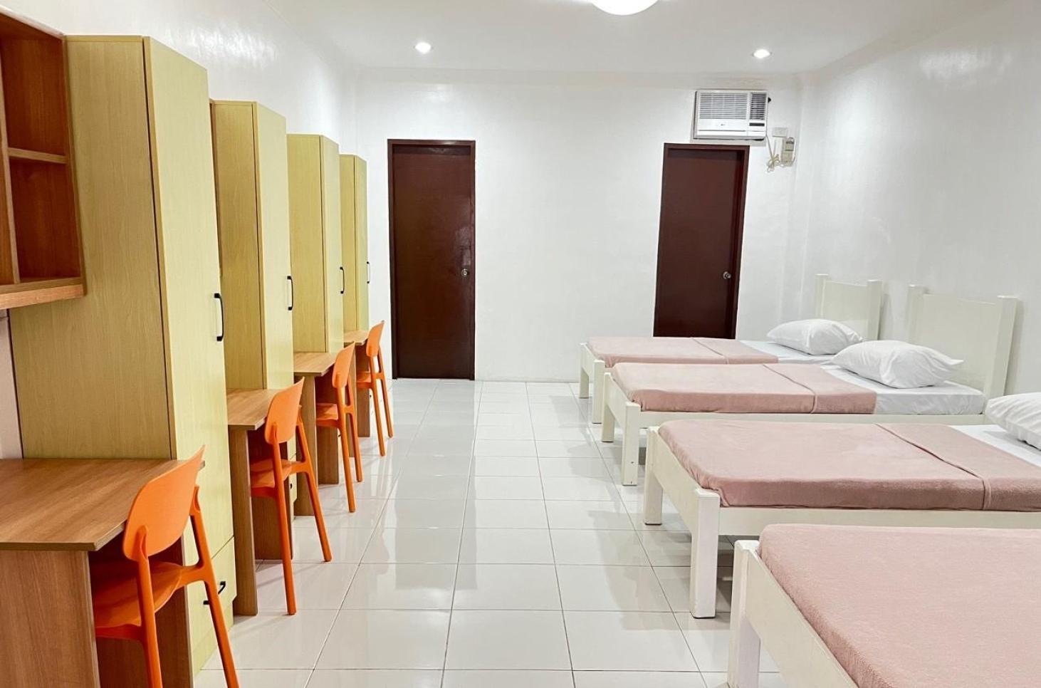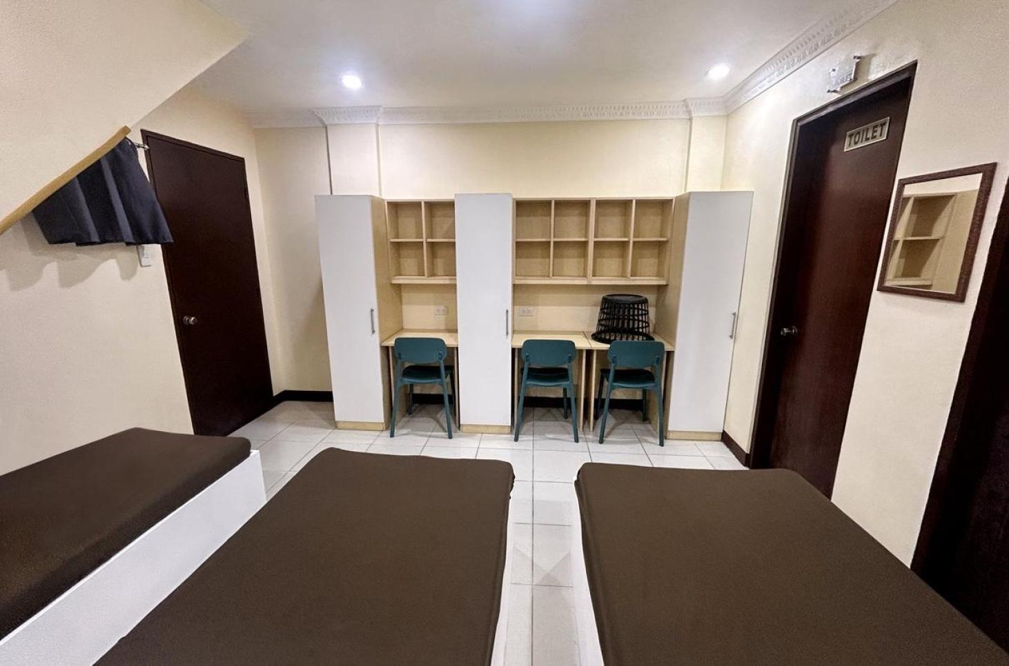 每一間單人房會和每一間雙人共用一個衛浴,所以每三位學生共用一間衛浴;三人房及四人房則是房間內有衛浴設備。