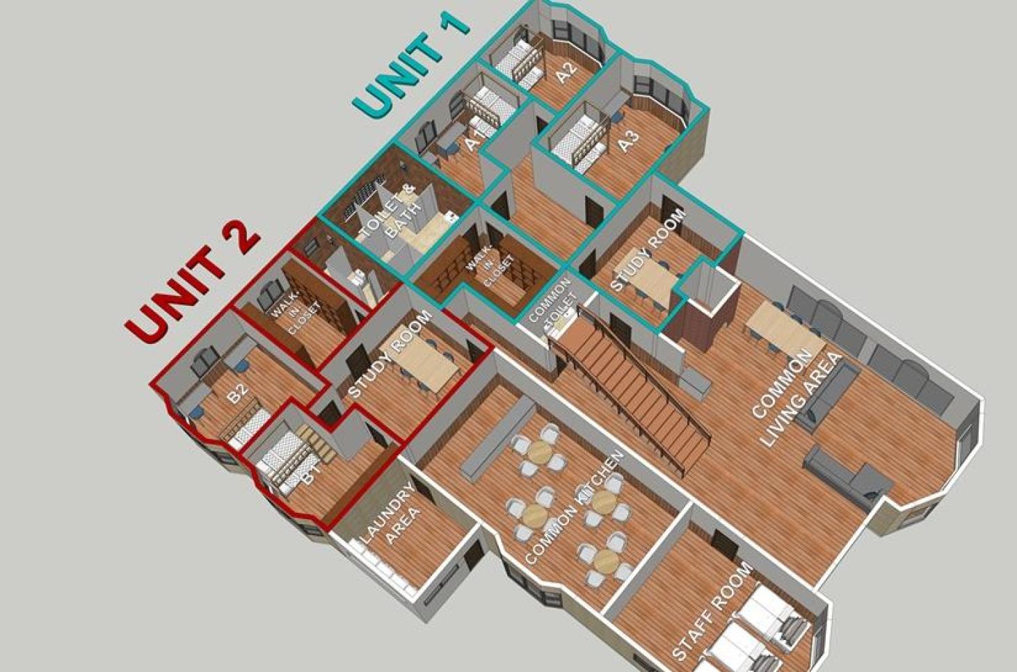 1. 分成兩層樓,一樓二樓都有房(男生一樓、女生二樓)。