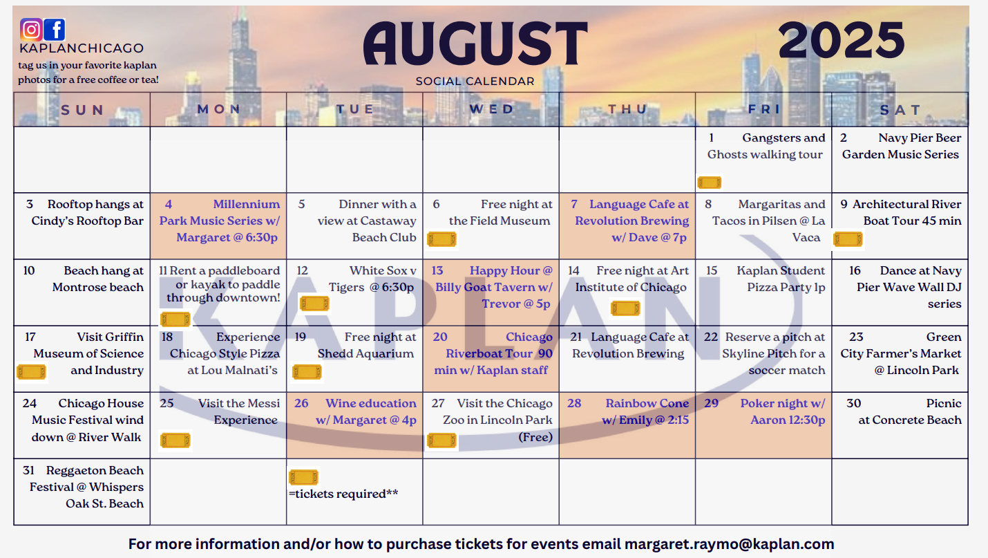 校區設有 17 間現代化教室,並配備兩間舒適的學生休息室。交通便利,門口即有公車站,步行 10 分鐘內即可抵達 捷運站(L-train)、Metra 火車站 及 水上計程車。同時,校區鄰近芝加哥河與夏季最受歡迎的 Oak Street Beach,也能輕鬆抵達風景優美的密西根湖畔,搭乘遊船欣賞壯麗的天際線,並探訪影集 《大熊餐館》(The Bear) 的取景場景。芝加哥更以 深盤披薩、爵士樂、禁酒令時期的傳奇故事、音樂劇 以及 華特‧迪士尼的誕生地 聞名,是一座兼具歷史底蘊與現代活力的學習之城。